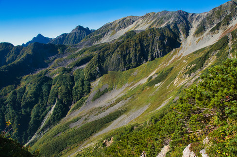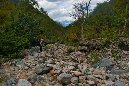 上高地BSから最初はダラダラ歩きが続く。普段から仕事前に山でクライミングをやっていて現在の体脂肪率がアスリート並の1桁台というTSさんは、テント泊装備の大きなザックを担いでいてもスタスタと進んでいく。足の長さの違いもあるせいか、こちらは結構急ぎ足でなんとかついていく。槍沢ロッジ前あたりから少しずつ登り基調となり時折差し込む強い日差しで徐々に体力が削られていく。途中、北鎌沢出会までの最終水場であるババ平で水を補給したが、ここまであまり水を消費しなかったこともあって、2Lくらいしか確保しなかった。結果的にこれが大失敗。槍沢ロッジで共同装備の火器類をTSさんに持ってもらっていたものの、水俣乗越までの急登と暑さで喉の渇きが一気に加速する。TNさんも暑さでだいぶ参ったようで、ロープをTSさんにお願いする。後で聞いた話では誰かに荷物(共同装備だが)を持ってもらうのは登山人生初らしく、ショックだったらしい。水俣乗越から北鎌沢出会までは下り基調だということで甘く見ていたが、ザレ場やガレ場で歩き辛い道が続き、なかなかペースが上がらない。ようやく北鎌沢出会に到着したものの、水場まではなかなか遠い。喉の渇きに耐えながら10分くらい下ると沢が流れており、冷たい水で渇きを癒す。体を冷やしてテン場に戻り、テントを設営する。その頃には雨が降り出し、夜中まで断続的に降り続いた。幕営場所は岩がゴロゴロしていてあまり良い場所が見つからなかった。